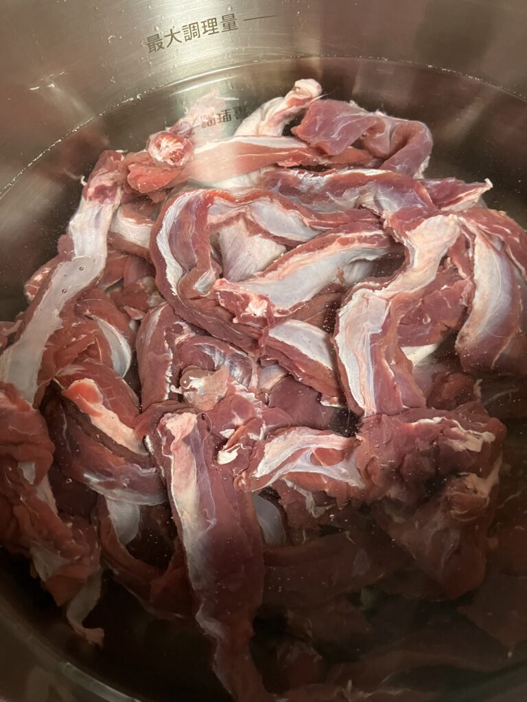 肉はキッチン鋏で一口大に切り、鍋に(圧力鍋でも)水と同量の肉出汁を入れ、梅干し1個、味噌、砂糖、酒、砂糖を加え、好みでこんにゃくを入れてコトコトと一時間~お好きな時間まで煮込みます。圧力鍋なら15分~20分