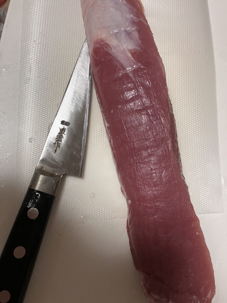 これはコストコで購入した豚ヒレ肉です。もうきれいにされてますが、残った筋をひきます包丁はマイ骨スキ包丁。手に馴染んで使いやすい子に育ちました〜。