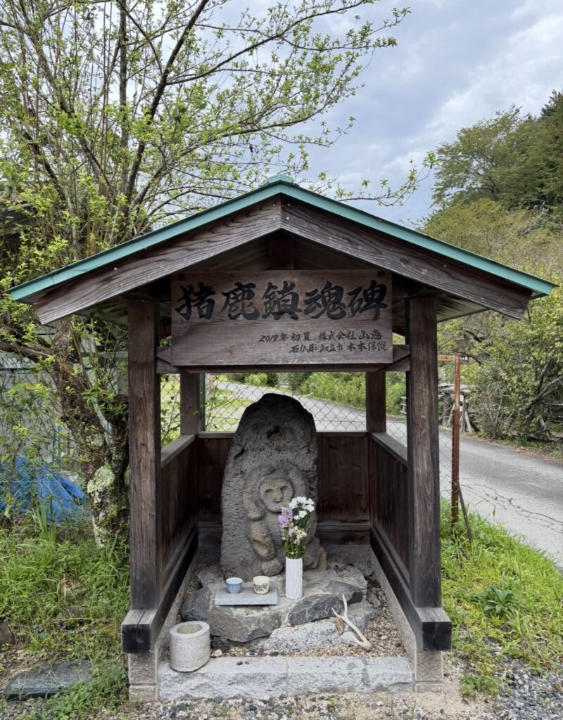 山から恵みを受け取っている山恵も、自然への感謝は創業当初から変わりなく、敷地内には「猪鹿鎮魂碑」が祀られています。初代社長の小澤庄一さんの想いが込められています。この文字は小澤さんの文字を真似て私が書いたものです。