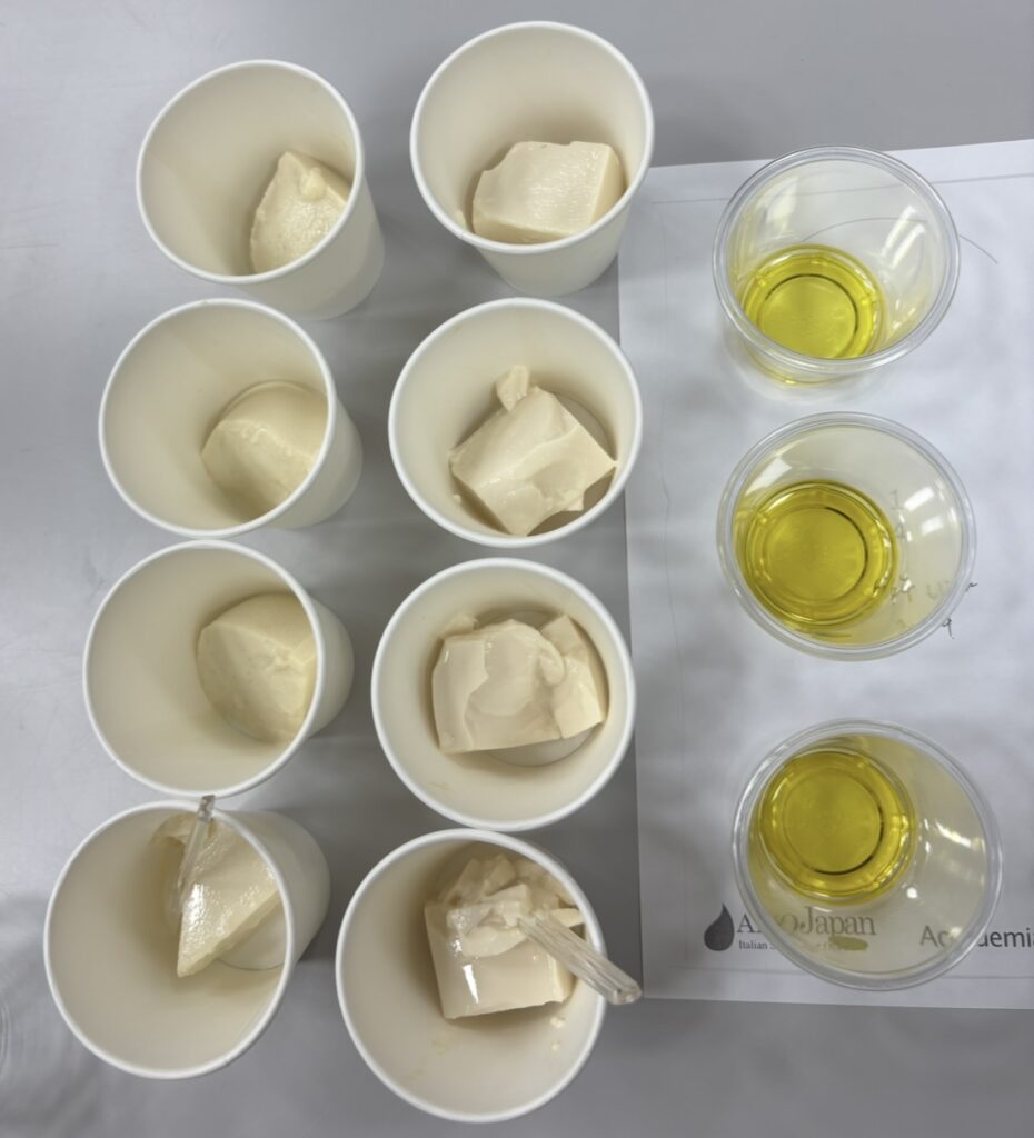 その後は、3種類のオリーブオイルを2種類の豆腐にかけて味わいました。これもはじめてのこと。
